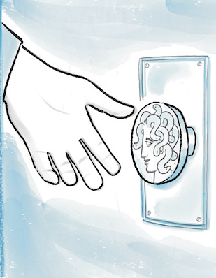 The doorknob on page one is based on an ancient Greek doorknob featuring Demeter, who you may remember as the mother of Persephone, the maiden who took a winter vacation to the Underworld. I changed Demeter to Medusa, who, in our popular culture, is a hideous snake-haired monster who can turn men to stone with a single look. In Clash of the Titans, a classic/super cheesy movie about Greek mythology, Perseus (Harry Hamlin) became a hero by slaying Medusa and using her head to turn the Kraken to stone. Dig the stop motion animation: